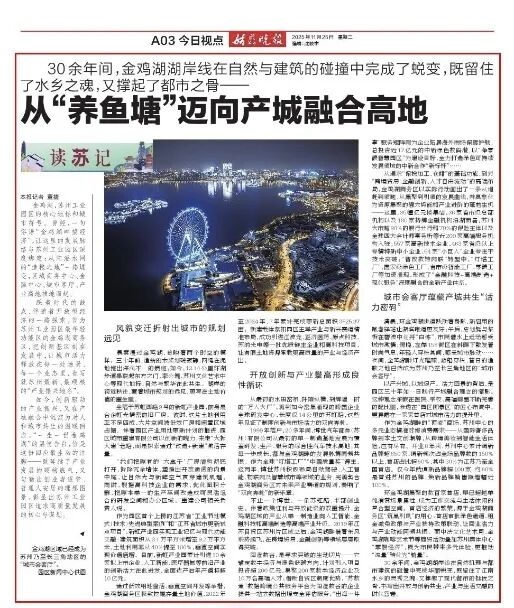 近日,《姑蘇晚報(bào)》整版關(guān)注金雞湖商務(wù)區(qū)建設(shè)成效,刊發(fā)文章《從“養(yǎng)魚塘”邁向產(chǎn)城融合高地》。