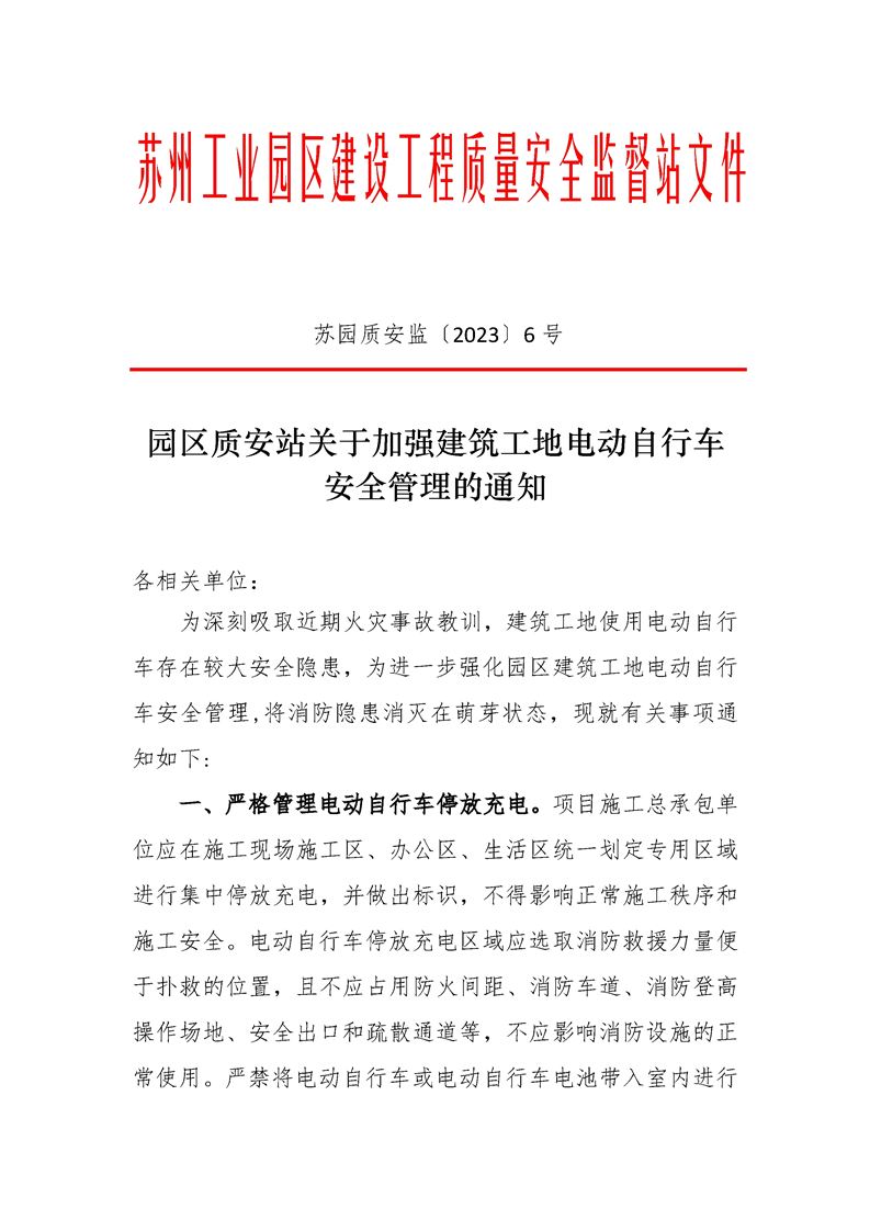 園區質安站關于加強建筑工地電動自行車安全管理的通知