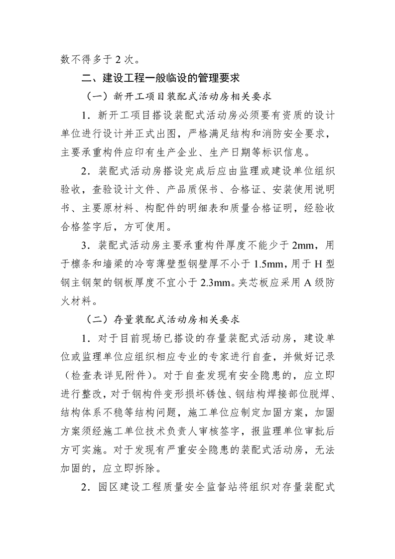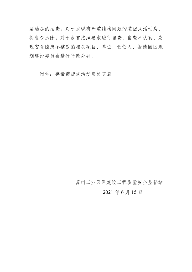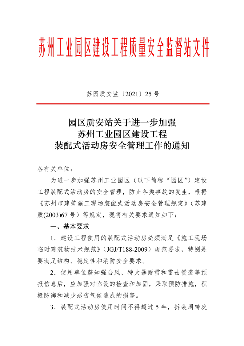 園區(qū)質(zhì)安站關(guān)于進(jìn)一步加強(qiáng)蘇州工業(yè)園區(qū)建設(shè)工程裝配式活動房安全管理工作的通知