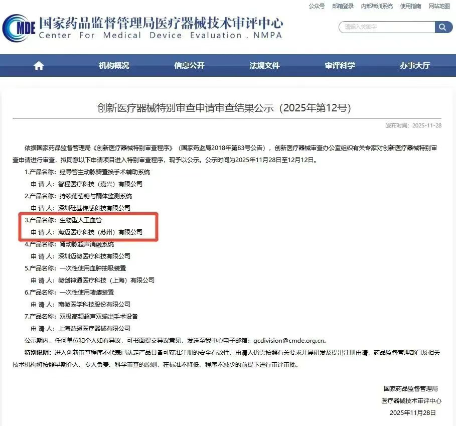 海邁醫療此次進入這一程序的產品是國產首款進入特別審查程序的小口徑(≤6mm)生物型人工血管,標志著在解決慢性腎衰血液透析血管通路這一重大臨床需求上,國產高端醫療器械實現了關鍵技術突破并取得重大里程碑進展。