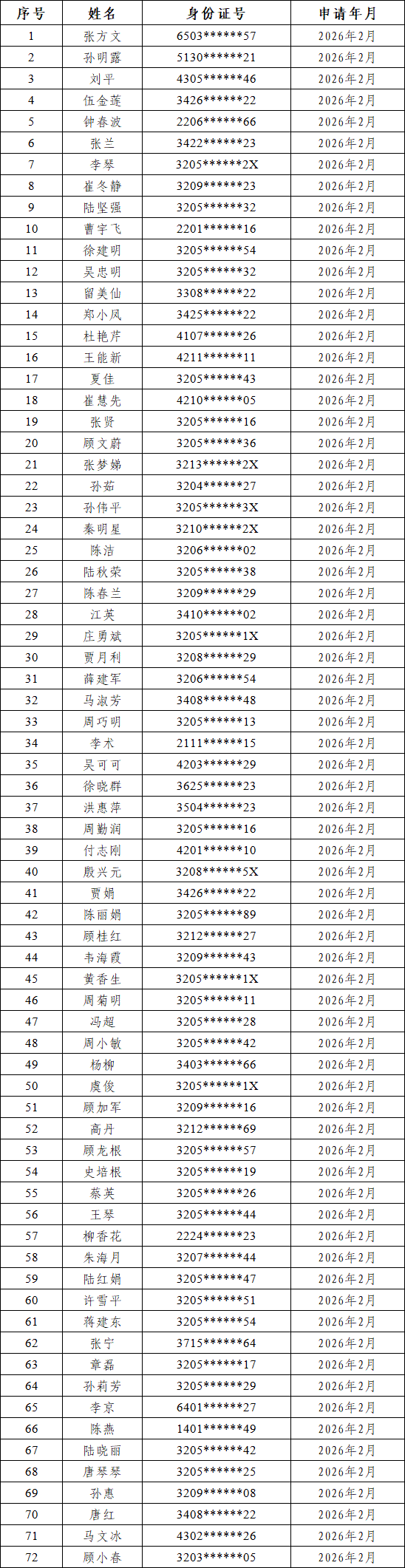 根據《江蘇省就業補助資金管理辦法》精神及業務有關規定,現將2026年2月園區靈活就業社保補貼新增人員相關信息進行公示,接受社會監督。公示期限為7天,公示自發布之日起。