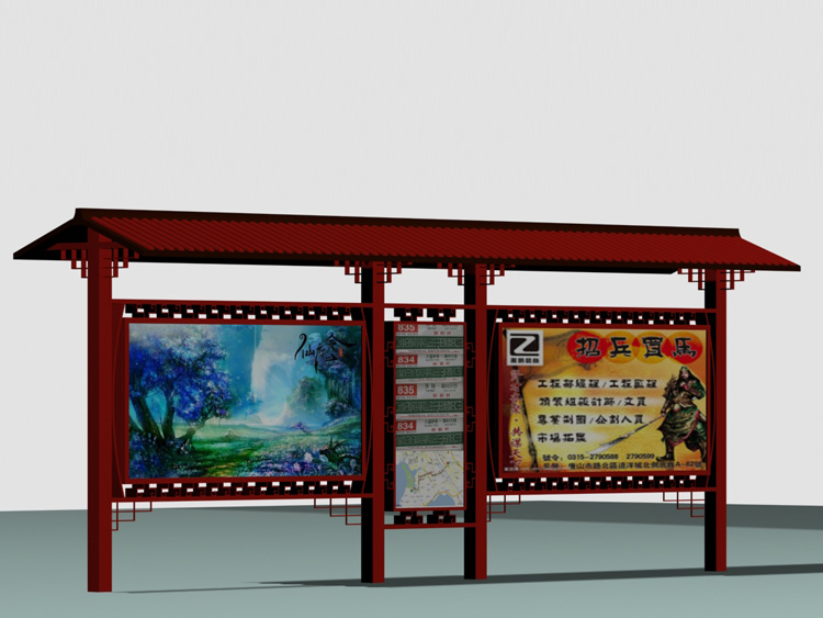 公交車候車亭一般是與公交站牌相配套的,為方便公交乘客候車時遮陽、防雨等,在車站、道路兩旁或綠化帶的港灣式公交停靠站上建設的交通設施。由于城市公交的日益發達,候車亭已發展成為城市一個不可或缺的重要組成部分,設計精美的候車亭也成為了城市一道美麗的風景。 一般候車亭棚體主要頂棚、立柱、頂弓、廣告燈箱和坐凳組成,也有用隔板來代替廣告燈箱的。
