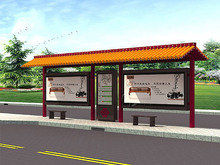 公交車候車亭一般是與公交站牌相配套的,為方便公交乘客候車時遮陽、防雨等,在車站、道路兩旁或綠化帶的港灣式公交停靠站上建設的交通設施。由于城市公交的日益發達,候車亭已發展成為城市一個不可或缺的重要組成部分,設計精美的候車亭也成為了城市一道美麗的風景。 一般候車亭棚體主要頂棚、立柱、頂弓、廣告燈箱和坐凳組成,也有用隔板來代替廣告燈箱的。