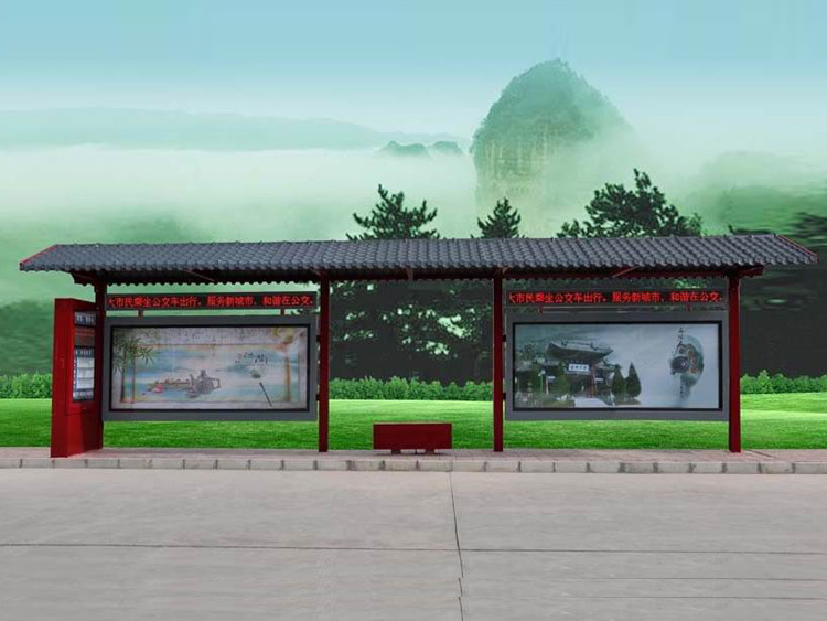 公交車候車亭一般是與公交站牌相配套的,為方便公交乘客候車時(shí)遮陽(yáng)、防雨等,在車站、道路兩旁或綠化帶的港灣式公交停靠站上建設(shè)的交通設(shè)施。由于城市公交的日益發(fā)達(dá),候車亭已發(fā)展成為城市一個(gè)不可或缺的重要組成部分,設(shè)計(jì)精美的候車亭也成為了城市一道美麗的風(fēng)景。 一般候車亭棚體主要頂棚、立柱、頂弓、廣告燈箱和坐凳組成,也有用隔板來(lái)代替廣告燈箱的。