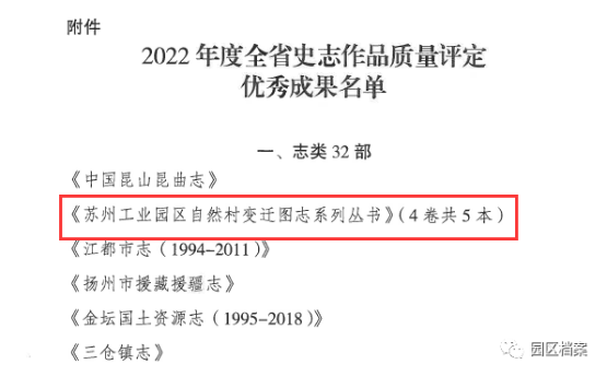 近日,由江蘇省地方志辦公室組織的2022年度全省史志作品質量評定結果揭曉,2部作品獲評江蘇省史志作品優秀成果,其中《中國名鎮志· 唯亭街道志》在24部名鎮名村志中名列第一,《蘇州工業園區自然村變遷圖志系列叢書》在32部志類作品中名列第二。