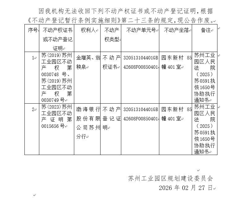 不動(dòng)產(chǎn)權(quán)證書(shū)/登記證明作廢公告蘇園 證廢字2026(0047)號(hào)(園東新村85幢401室)