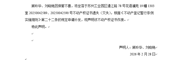 關于蘇州工業園區通江路78號花語瀾苑19幢1303室20250042589、20250042590號動產權證書遺失聲明
