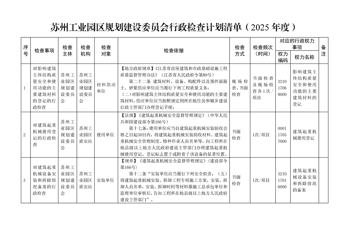 蘇州工業園區規劃建設委員會行政檢查計劃清單(2025年度)