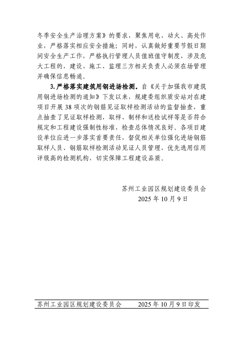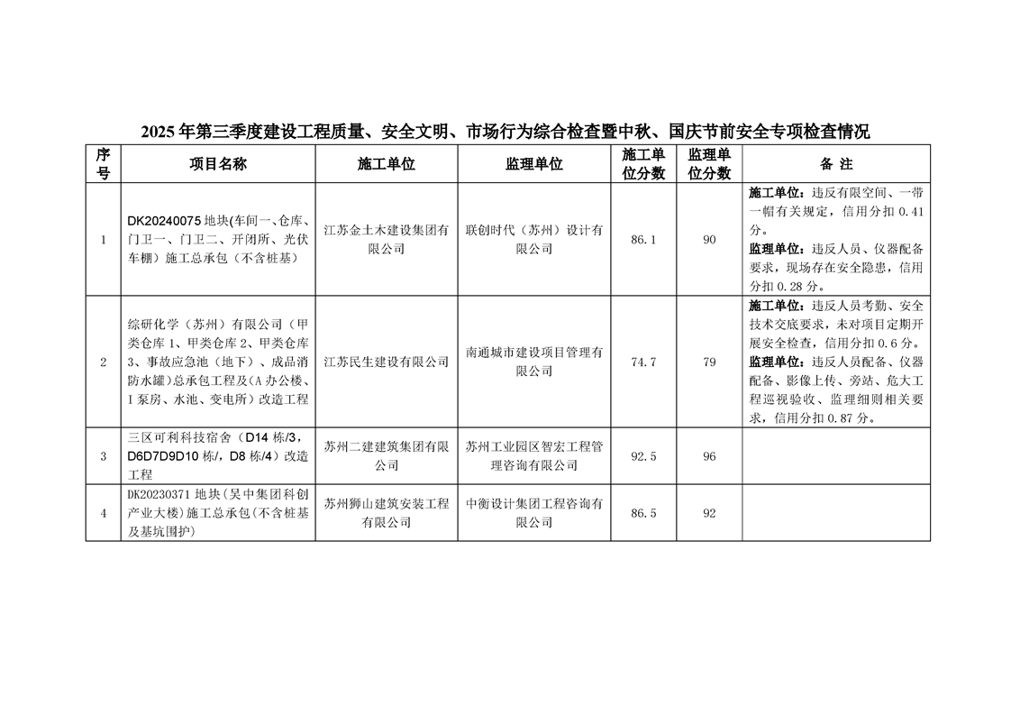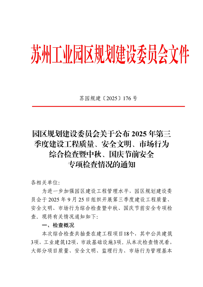 園區(qū)規(guī)劃建設(shè)委員會關(guān)于公布2025年第三季度建設(shè)工程質(zhì)量、安全文明、市場行為綜合檢查暨中秋、國慶節(jié)前安全專項檢查情況的通知