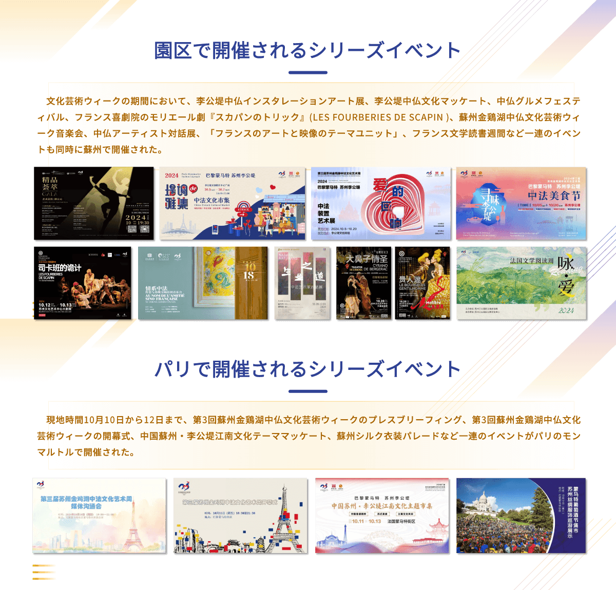 現(xiàn)地時(shí)間10月11日の夜、2024第3回蘇州金鶏湖中仏文化蕓術(shù)ウィークはパリのモンマルトルで幕を開けた。パリ第18區(qū)政府、パリコンベンション観光局、パリの大學(xué)、博物館、銀行、投資ファンド、文化観光企業(yè)からの100人以上のゲストが一堂に集まり、交流と協(xié)力について共に検討した。 イベントでは、園區(qū)文化體育観光局の責(zé)任者は蘇州及び蘇州工業(yè)園區(qū)の地理的優(yōu)位性、文化的背景、産業(yè)クラスター、投資環(huán)境、政府サービスなどについて詳しいプロモーションを行った。 會場では、パリ第18區(qū)政府、パリコンベンション観光局、仏中協(xié)力交流協(xié)會、モンマルトル商會、テイラーアーティスト基金會の代表が次々と発言した。また、現(xiàn)場では昆曲のパフォーマンスと蘇州工業(yè)園の寫真展も行われた。 今回の蘇州金鶏湖中仏文化蕓術(shù)ウィークは10月5日から10月20日までパリと蘇州の両地で同時(shí)に開催され、合計(jì)13回...