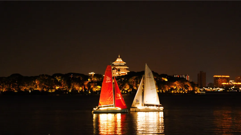 帆船夜航巡演結合帆船風格和視覺享受,在右岸水域精心規劃夜航巡演線路,在夜幕降臨時,燈光裝點的船只成為水面上的一道亮麗風景,和周圍環境的美景相互映襯。