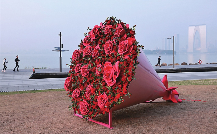 昨日,園區(qū)金雞湖北,草坪上的特大花束美麗動(dòng)人,十分吸睛。