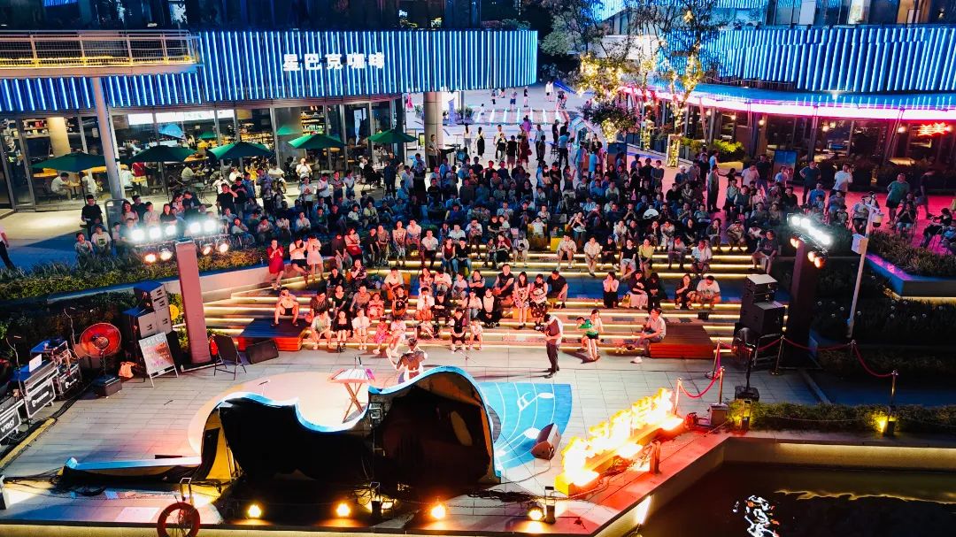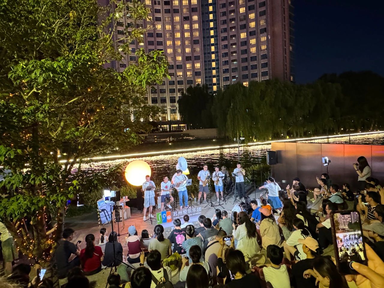 昨晚,水岸音樂會同樣在圓融時代廣場精彩上演。南京藝術學院歌手與蘇州市歌舞劇院樂手聯袂獻藝,帶來《海芋戀》《月亮代表我的心》等流行與民樂跨界曲目。觀眾席中掌聲與合唱聲此起彼伏,熒光點點隨節奏搖曳,夜色中的水岸洋溢著浪漫與活力。