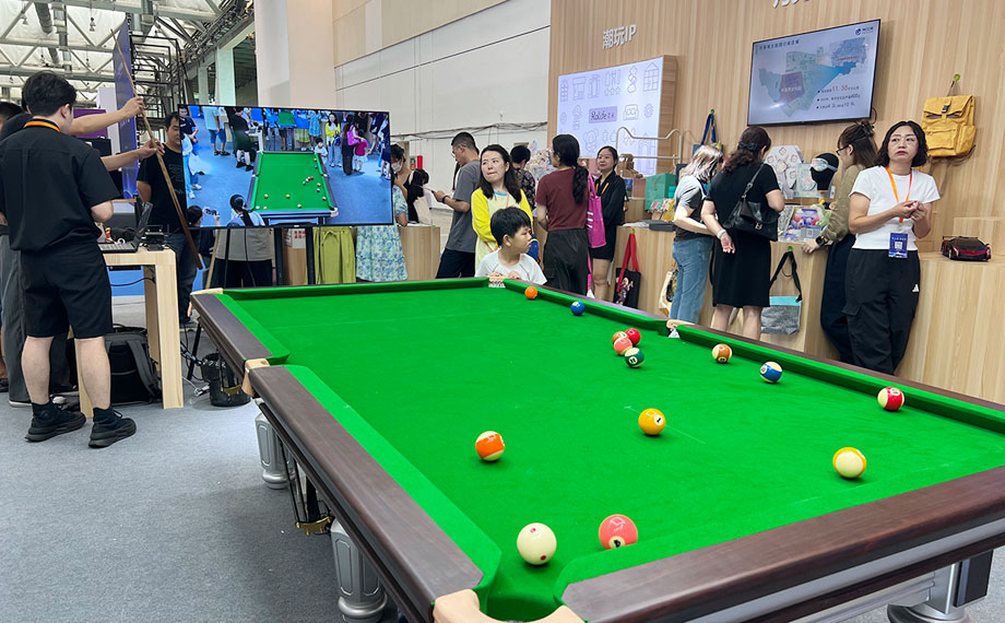 在臺球直播區(qū),前央視金牌解說劉建宏正在做智能臺球直播演示。只見臺球開球后,視頻畫面鏡頭自動切換、比賽數(shù)據(jù)同步收集呈現(xiàn)。