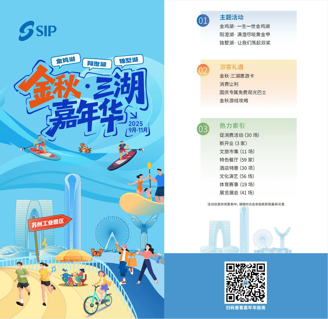 金雞湖畔千人合唱聲動湖面,陽澄湖邊蟹肥膏黃滿席飄香,獨墅湖上水上盛會激情洋溢——今年秋天,蘇州工業園區以“金秋?三湖嘉年華”為舞臺,首次系統整合金雞湖、陽澄湖、獨墅湖三大湖區資源,奏響了一曲動人的文旅商“協奏曲”。 “園區三湖就如同三顆明珠,各自綻放異彩,彼此間又相互輝映。”園區文體旅游局相關負責人表示,在為期三個月的“金秋?三湖嘉年華”期間,園區在以往單點開發的基礎上,對三湖資源進行差異化定位和聯動發展,通過豐富的活動、沉浸的體驗、惠民的政策,展現金秋園區的無限魅力,推動區域文旅IP從“單點閃耀”邁向“全域共鳴”。 三湖“交響曲”:各美其美,美美與共 “沿著金雞湖來一場... [詳細]