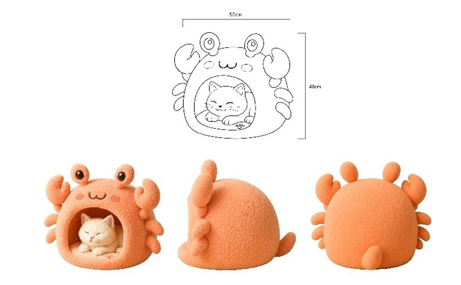 作品以“陽澄湖大閘蟹”為靈感,結合寵物友好主題進行設計。延伸出一系列包含螃蟹貓窩、水杯、頭盔、寵物碗的設計,整體造型Q萌。不僅滿足寵物的休憩需求,同時也呼應了環保與循環利用理念。