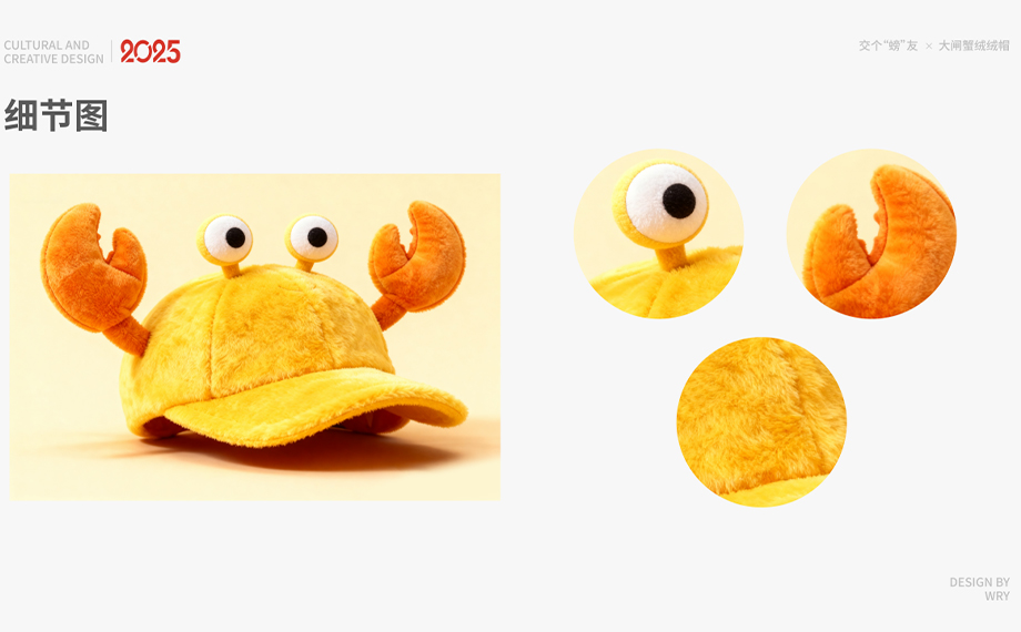 該作品以傳統“蟹八件”為靈感,打造了一套涵蓋毛絨掛件、健康錘、化妝鏡等八件蟹主題系列作品。運用“有鉗”諧音,衍生出“馬上有鉗、有鉗有好運、身體就是本鉗”等系列正能量口號,將美好的祝福融入日常生活的每個角落。