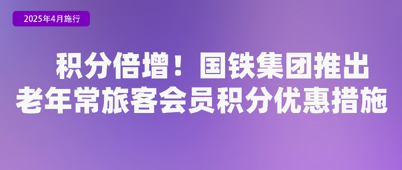 4月1日起,國(guó)鐵集團(tuán)在現(xiàn)行“鐵路暢行”常旅客會(huì)員服務(wù)基礎(chǔ)上,對(duì)年滿60周歲持居民身份證、港澳居民居住證、臺(tái)灣居民居住證、港澳居民來(lái)往內(nèi)地通行證、臺(tái)灣居民來(lái)往大陸通行證、外國(guó)人永久居留身份證的老年常旅客會(huì)員實(shí)施更大幅度的積分優(yōu)惠,積分可兌換火車票,將更好地滿足老年旅客對(duì)美好旅行生活的向往,為促進(jìn)銀發(fā)經(jīng)濟(jì)發(fā)展、擴(kuò)大服務(wù)消費(fèi)注入新動(dòng)能。