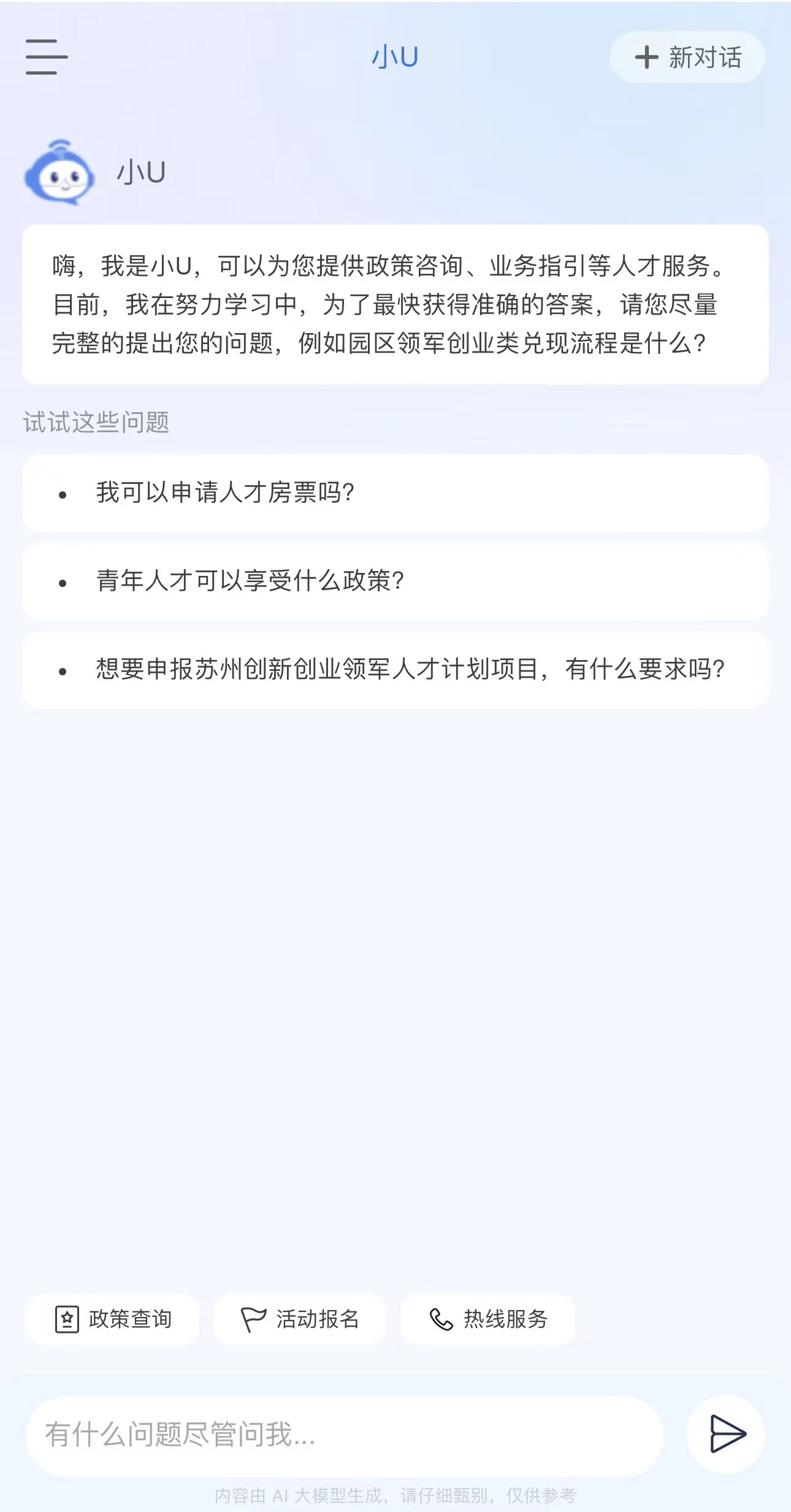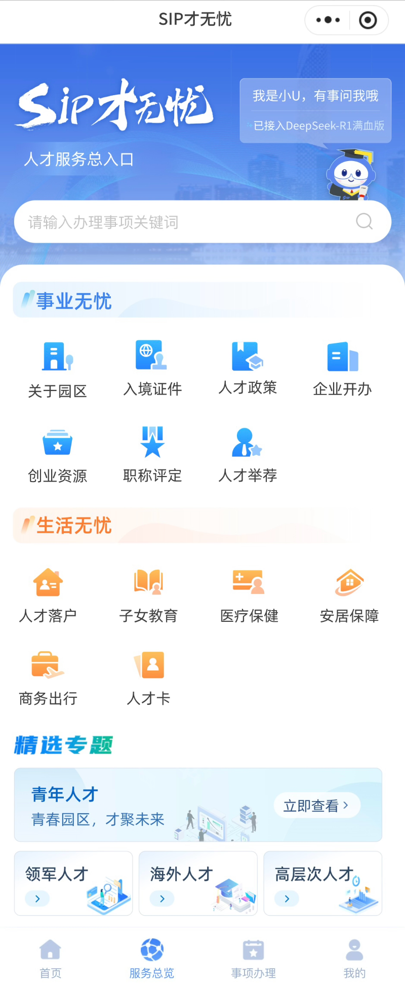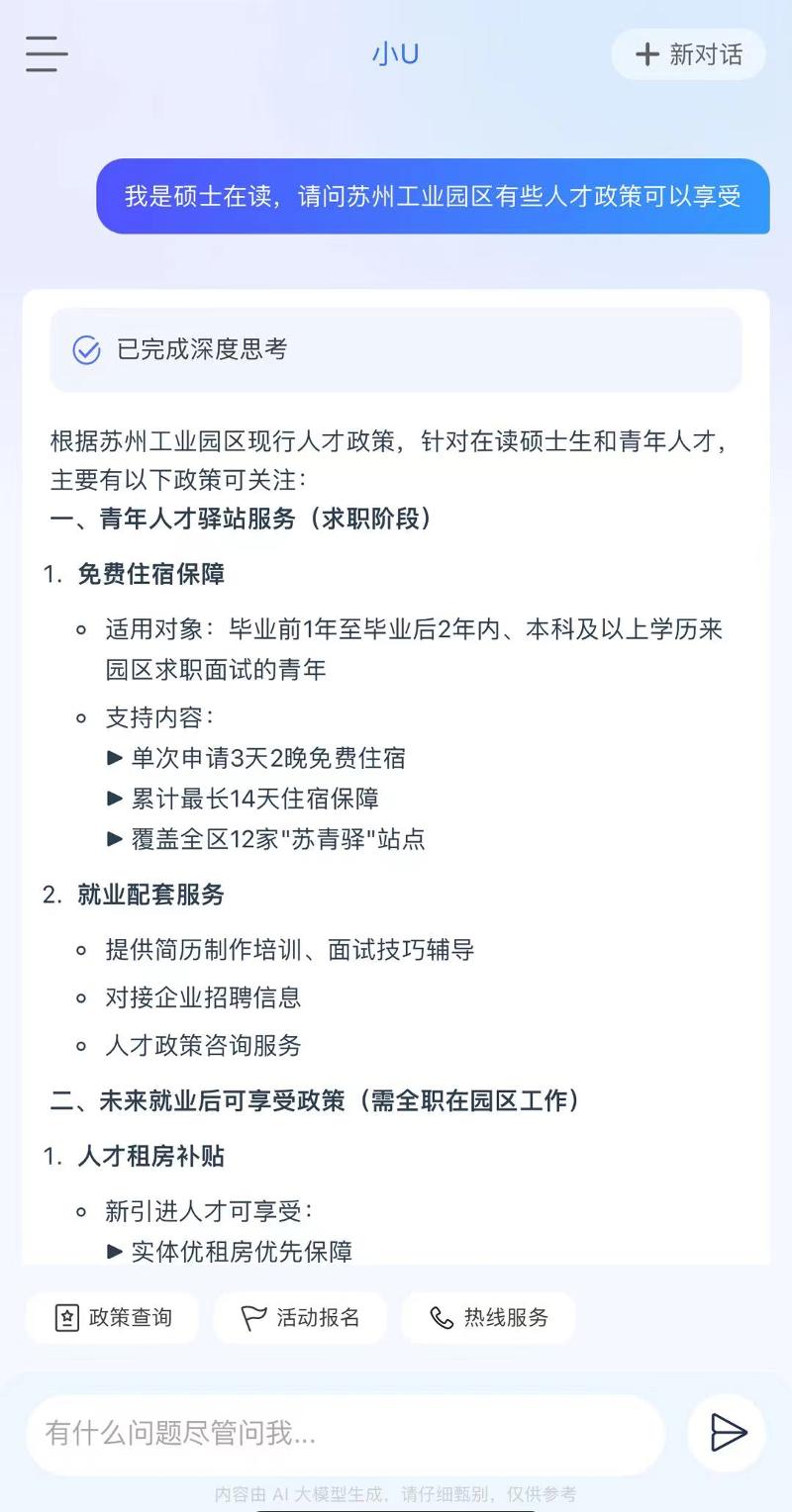“SIP才無憂”深度聚焦提升人才的使用體驗(yàn),通過接入DeepSeek-R1“滿血版”,全新推出首個(gè)高智版AI助手“小U”,構(gòu)建智能化人才服務(wù)體系,實(shí)現(xiàn)“政策秒配、服務(wù)無界”。