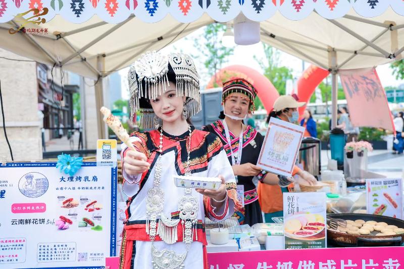 “龍舟有好市”民族美食市集同樣人氣爆棚,美食市集匯集30余個(gè)美食攤位,來(lái)自23個(gè)不同民族美食香氣四溢,打造舌尖上的“民族風(fēng)”,為現(xiàn)場(chǎng)市民游客提供充足能量補(bǔ)給。剛出爐的烤乳扇滋滋作響,刷上玫瑰醬,甜香撲鼻;軟糯的朝鮮打糕裹著豆面和糖粉,引得游客們紛紛駐足購(gòu)買品嘗。