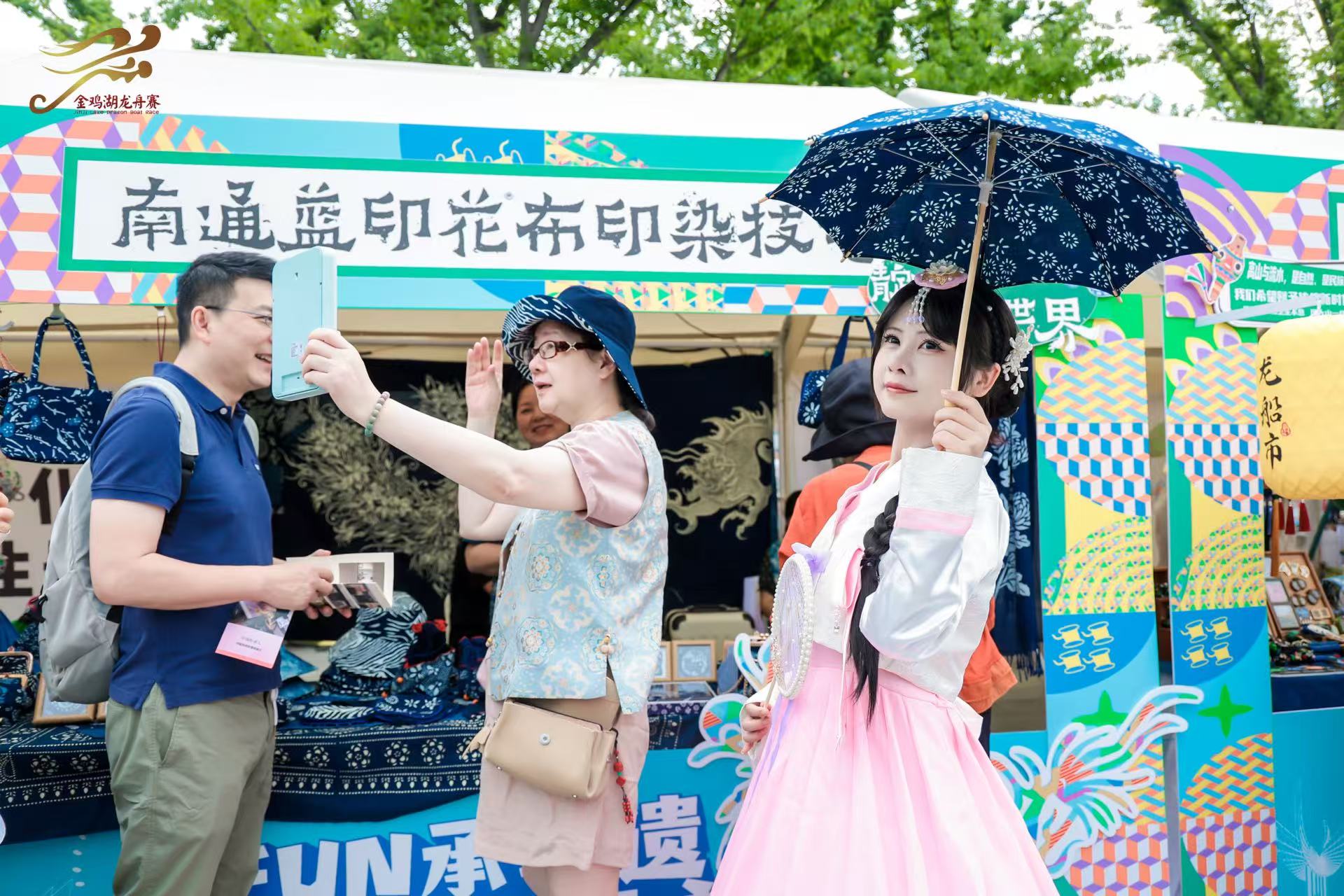 南通藍(lán)染、鎮(zhèn)江竹編、阿林老繡、貴州印染、秋和月手作纏花、山澗民族風(fēng)文創(chuàng)等6項(xiàng)外地非遺及品牌首次參與盛會(huì)。南通藍(lán)染技藝市級(jí)傳承人曹春燕一邊耐心地向大家展示藍(lán)染制品,一邊興奮地說(shuō):“攤位上的藍(lán)染制品都是純手工制作,這次我們是第一次到金雞湖龍船市擺攤,好多小朋友都對(duì)藍(lán)印花布的制作工藝很感興趣,我們都一一介紹,這個(gè)平臺(tái)真是太棒了,給了這項(xiàng)古老技藝一個(gè)絕佳的推廣展示機(jī)會(huì),讓更多人了解藍(lán)染、愛上藍(lán)染。”