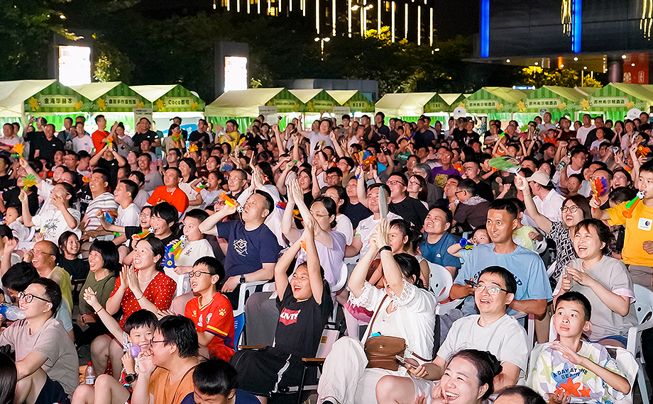 “開始了,開始了!”晚上7點(diǎn),隨著蘇州隊(duì)迎戰(zhàn)揚(yáng)州隊(duì)的哨聲響起,文星廣場的投影前爆發(fā)出陣陣歡呼聲。球迷們或坐或站,眼睛緊盯著屏幕上的每一次傳球、射門。每當(dāng)有隊(duì)伍發(fā)起進(jìn)攻,現(xiàn)場便掀起一陣聲浪。比賽開始一分多鐘,蘇州隊(duì)的率先進(jìn)球更是在現(xiàn)場掀起第一波高潮。