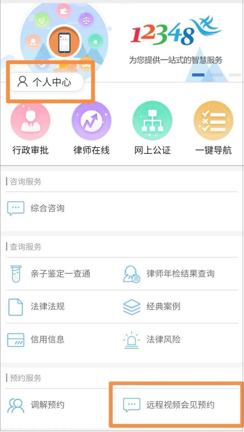 第二步:進(jìn)入公眾號(hào)后,點(diǎn)擊頁(yè)面底端“法律服務(wù)”,新用戶(hù)需要先點(diǎn)擊左上角的“個(gè)人中心”進(jìn)行注冊(cè)。注冊(cè)后,在法律服務(wù)頁(yè)面“預(yù)約服務(wù)”板塊點(diǎn)擊“遠(yuǎn)程視頻會(huì)見(jiàn)預(yù)約”。