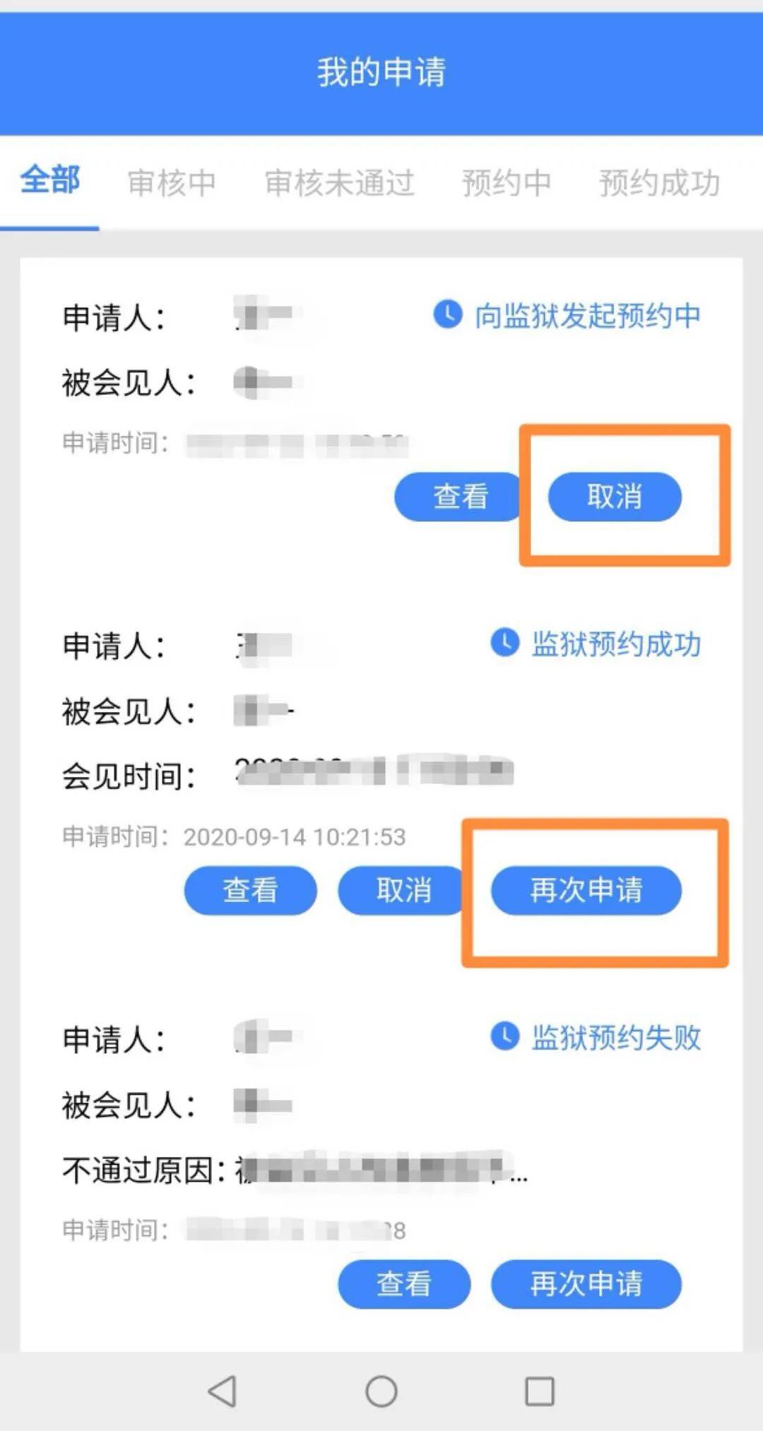 服刑人員家屬因故需要取消會(huì)見(jiàn)的,需在“我的申請(qǐng)”中進(jìn)行“取消”會(huì)見(jiàn)操作、寫(xiě)明原因,同時(shí)電話致電工作人員取消會(huì)見(jiàn),以便工作人員及時(shí)與監(jiān)獄對(duì)接。向監(jiān)獄預(yù)約成功后,會(huì)見(jiàn)申請(qǐng)人無(wú)故取消會(huì)見(jiàn)的,半年內(nèi)不再安排遠(yuǎn)程視頻會(huì)見(jiàn)。