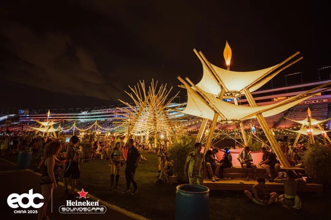 The EDCChina 2025 offered not just music, but also a variety of artistic and culturalexperiences. The BAMBOOVILLAGE was full of bamboo structures which demonstrated perfect integration ofnature and art. People could get free water there and sit down on a bench inthe open pavilion to take a rest. Thedazzling, surrealistic PIXEL FOREST offered the visitors a place to appreciatethe unique charm of intertwined light and shade.Nearthe circuitGROUNDS stage stood “RISE”, an artistic installation that was new tothe EDC program. Randombursts of fire took place to the rhythm, creating the wonderful backdrop forsnapshots. The CHAPEL was a pl... [MORE]