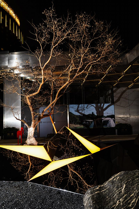 Nearby, at Jinji Station 09, another installation, named “Die Shi Kui Tian”, features a more Eastern aesthetic style. Inspired by rockeries in Suzhou’s classical gardens, its geometric lines reimagine traditional decorative rockery art. Also made of stainless steel, it captures the sky, clouds, architecture and visitors within its angles, folding the world into a miniature “mirror courtyard”. Notably, its colors shift with natural light.
