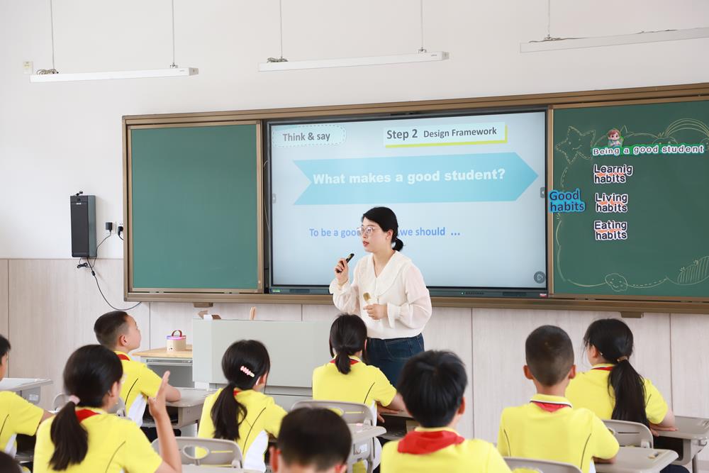 婁葑實驗小學的王玨老師執教的《Beingagoodstudent》采用項目化的課程設計,用制作大海報作為整節課的主線串聯。課堂中,王老師充分運用AI賦能,服務課堂,從主題的確認,框架設計到內容填補這樣一種海報設計思路將六上前四個單元知識點進行了整合和拓展,學生在任務驅動的過程中英語綜合素養得到了提升。