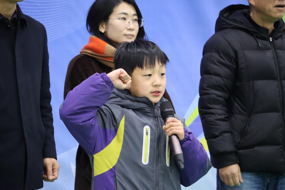 隨后,運動員代表登臺合影,裁判員代表陳子強老師與運動員代表封金明同學先后宣誓。