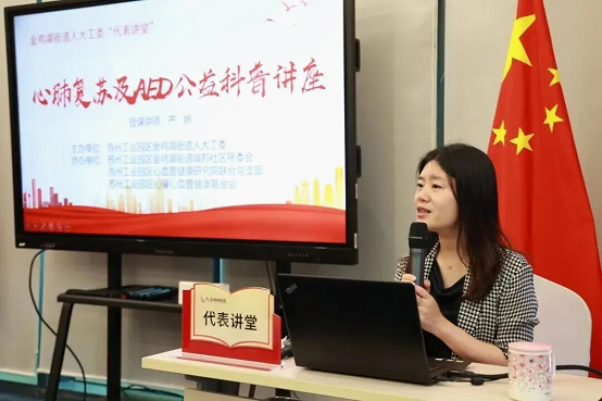 建議的提出只是開始,真正的成效要落到實處。嚴婷不僅是建言者更是行動的先行者。她投身急救知識普及,成為金雞湖街道代表講堂的常客,開設《心肺復蘇及自動體外除顫器使用》公益課程,通過理論+實操的方式,讓群眾快速掌握急救技能。在世界心臟日等重要節點,她牽頭在蘇州中心、基層社區組織大型義診和健康科普活動,累計服務群眾近萬人次。